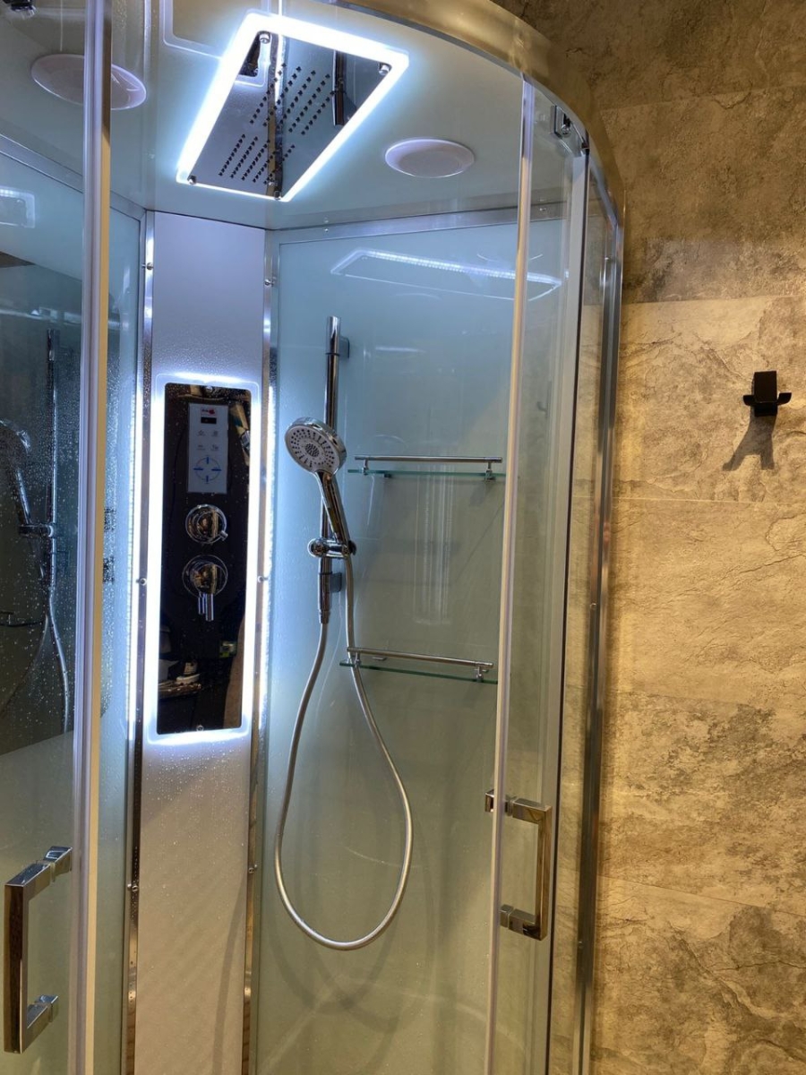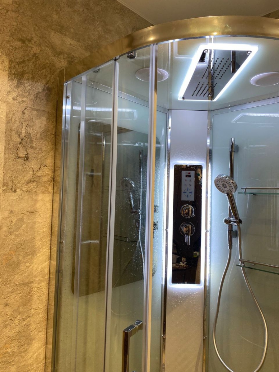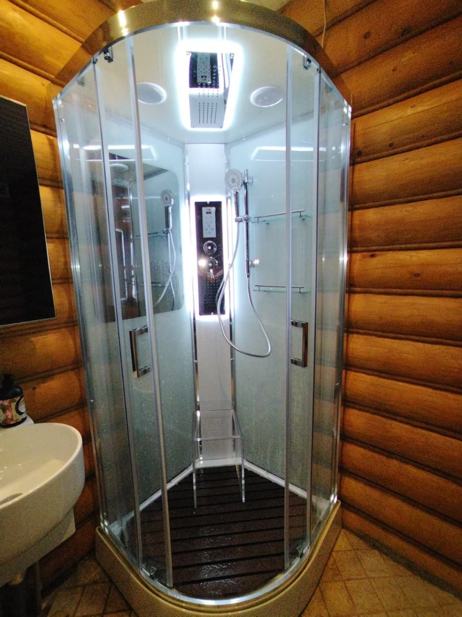 - Оснащение:Блютуз / LED подсветка /радио /вытяжка/гидромассаж спины/полимерная вставка в поддон(имитация дерева)/сифон/ Переключатель режимов /2-е Полочки /резьбовой смеситель / Тропический (верхний) душ/ручки дверей из нержавейки /арома-лейка с витамином С/ Душевая