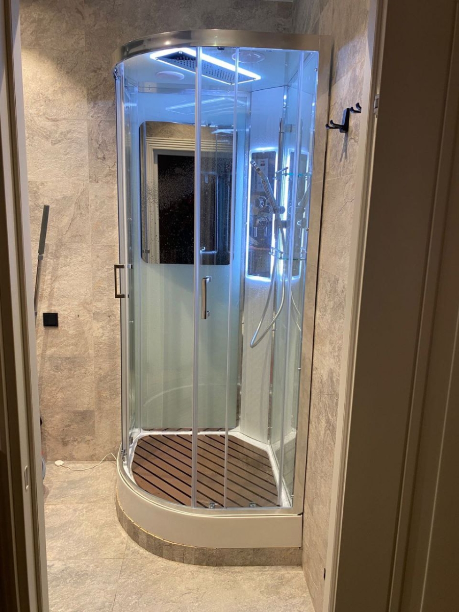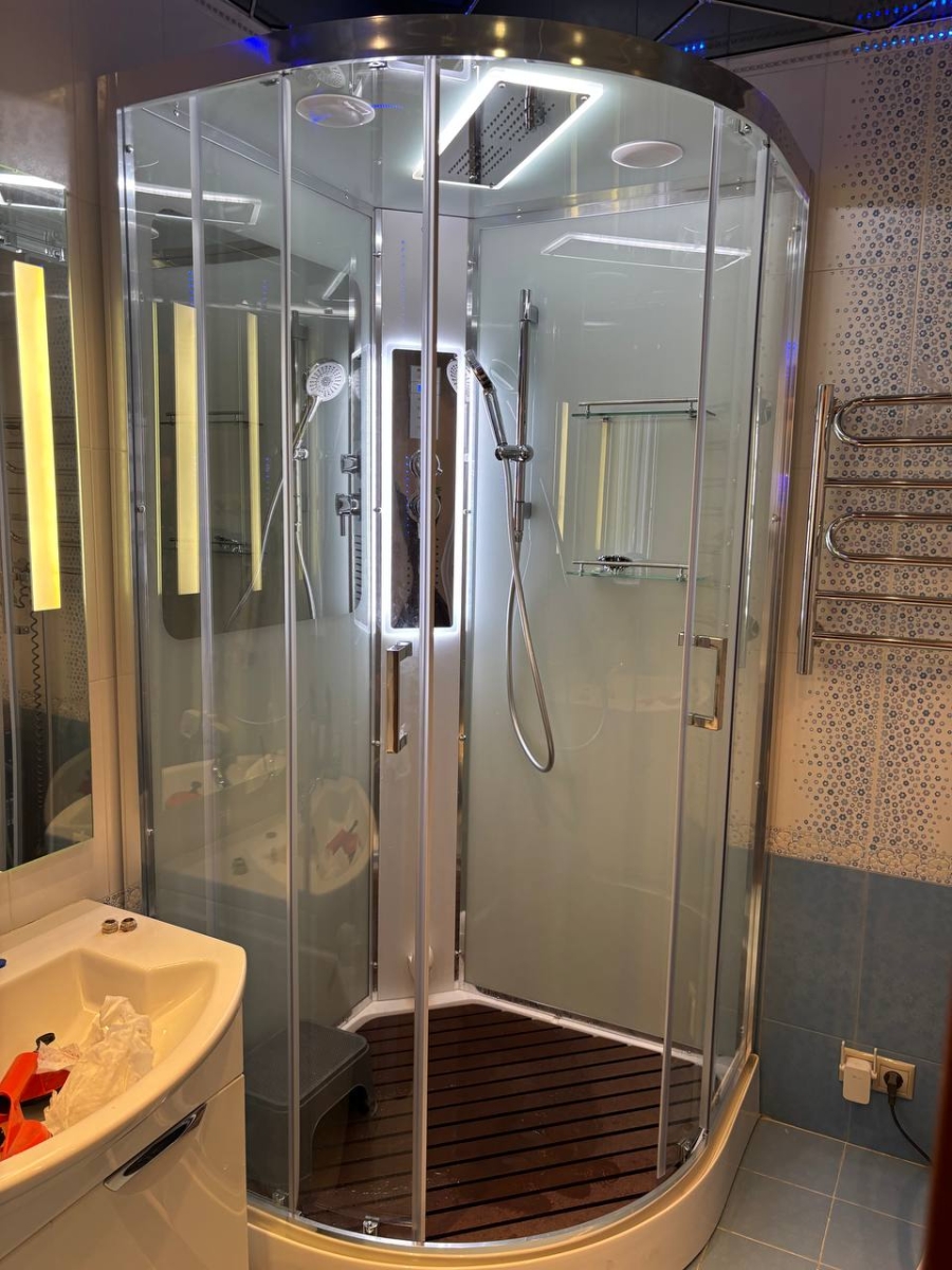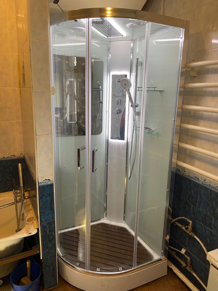 - Оснащение:Блютуз / LED подсветка /радио /вытяжка/гидромассаж спины/полимерная вставка в поддон(имитация дерева)/сифон/ Переключатель режимов /2-е Полочки /резьбовой смеситель / Тропический (верхний) душ/ручки дверей из нержавейки /арома-лейка с витамином С/ Душевая