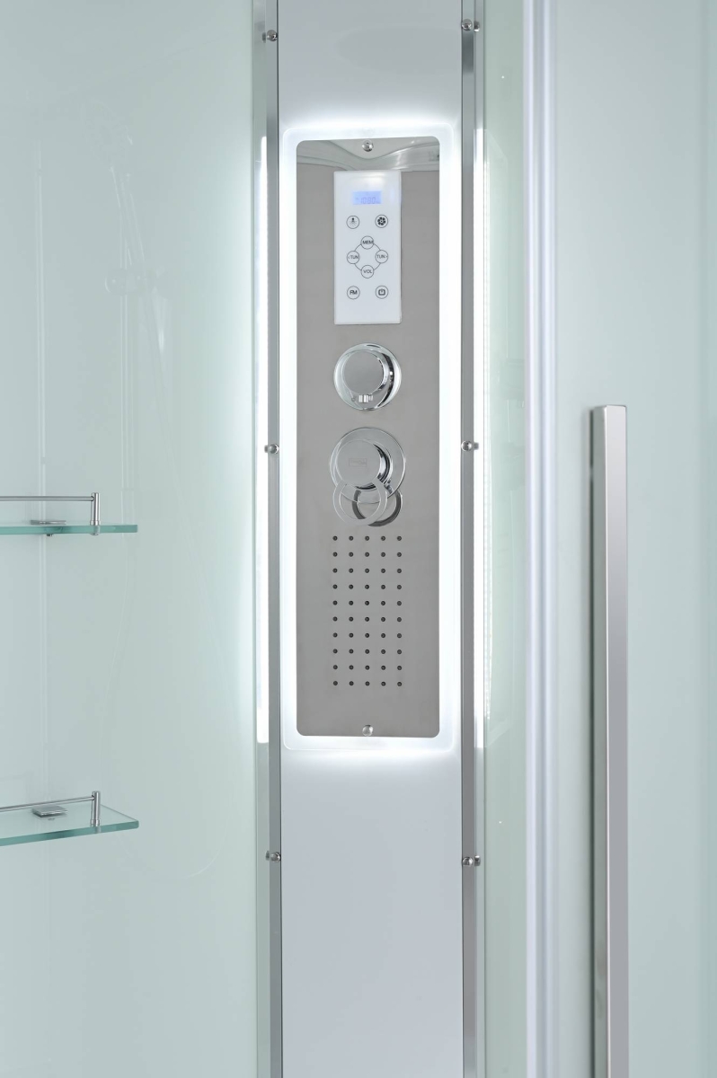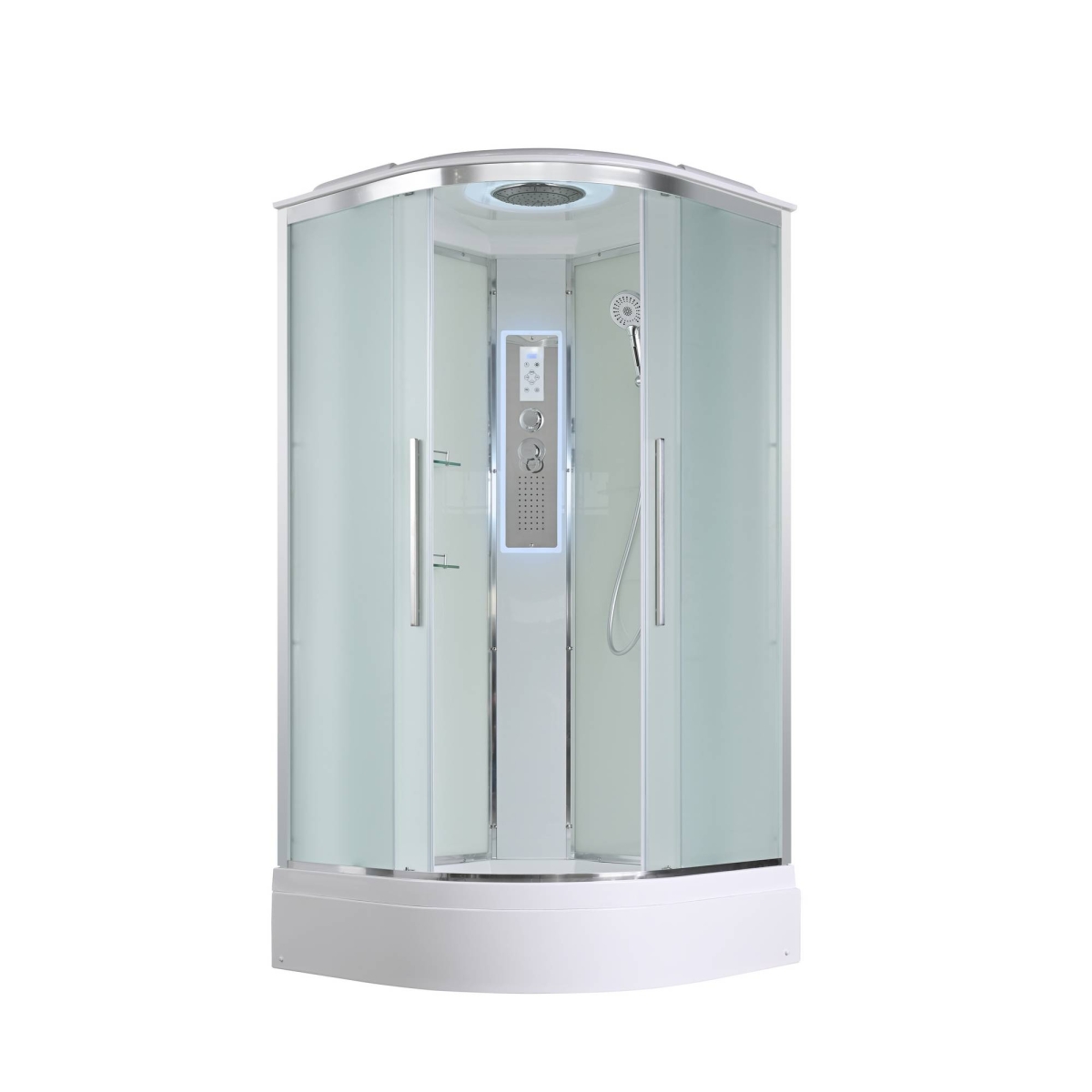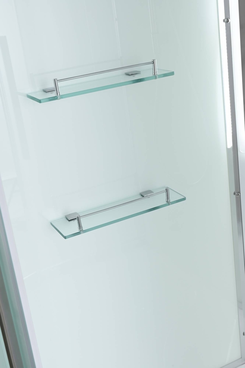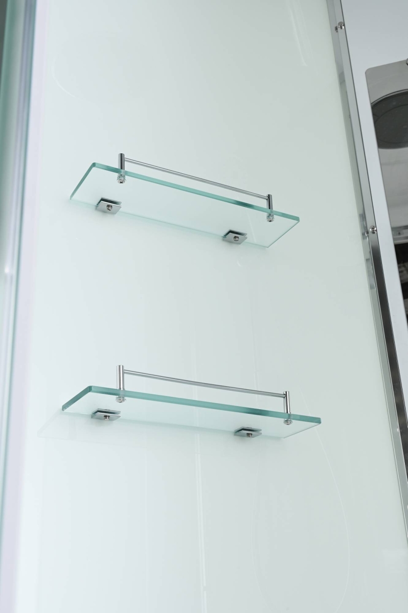 - Оснащение: Блютуз / LED подсветка /радио /вытяжка/гидромассаж спины/сифон/ Переключатель режимов /2-е Полочки /резьбовой смеситель / Тропический (верхний) душ/ручки дверей из нержавейки /арома-лейка с витамином С/ Душевая