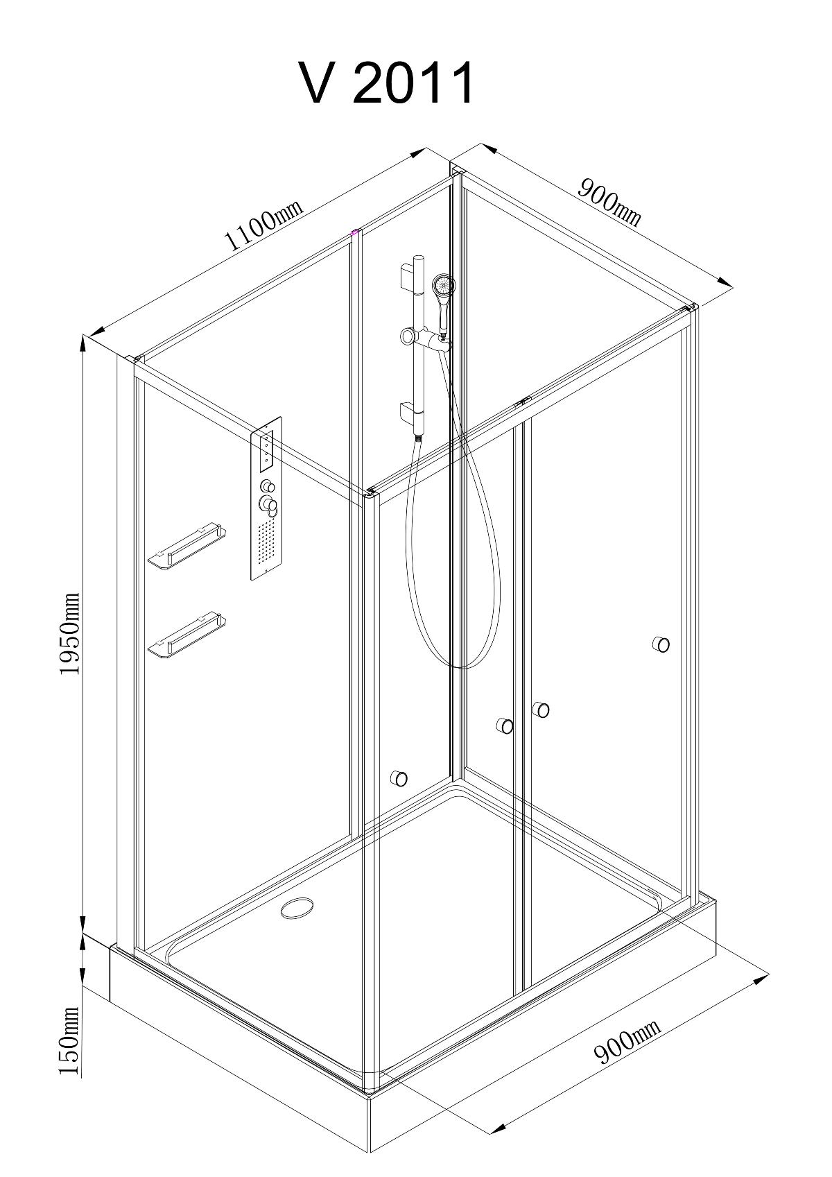 - Оснащение:полимерная вставка в поддон(имитация дерева)/сифон/ Переключатель режимов /2-е Полочки /резьбовой смеситель /ручки дверей /арома-лейка с витамином С/ Душевая штанга