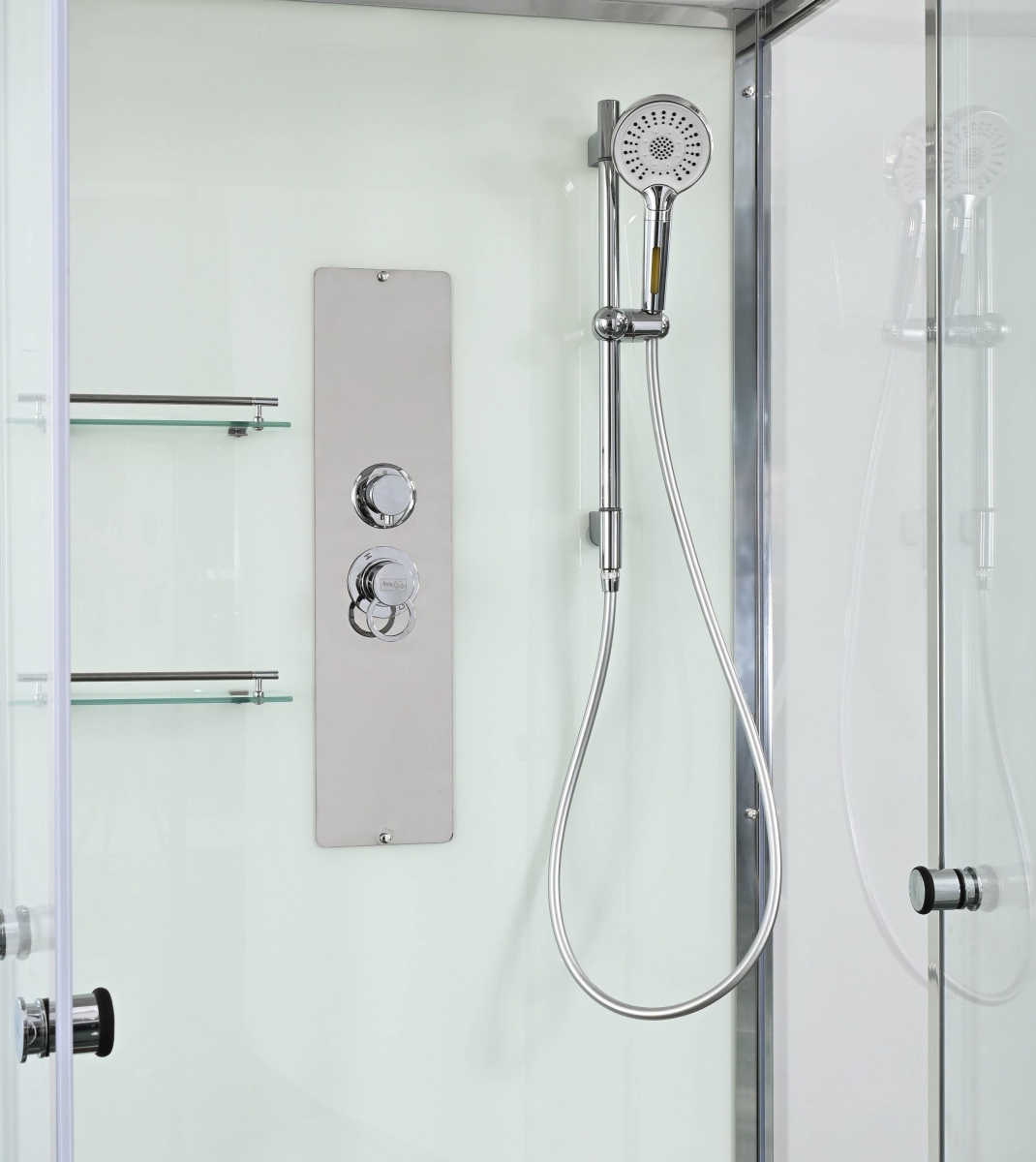 - Оснащение:полимерная вставка в поддон(имитация дерева)/сифон/ Переключатель режимов /2-е Полочки /резьбовой смеситель /ручки дверей /арома-лейка с витамином С/ Душевая штанга
