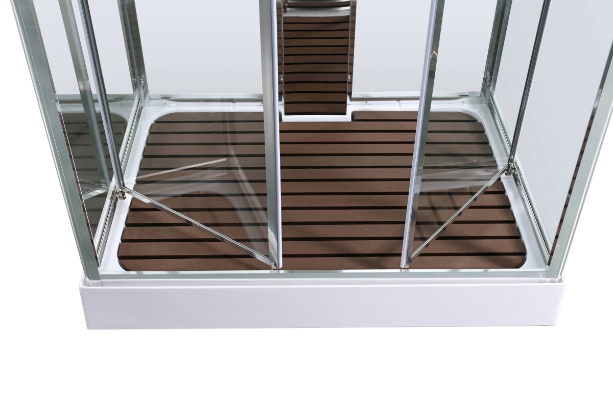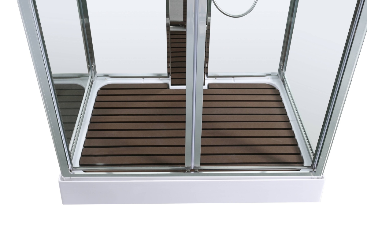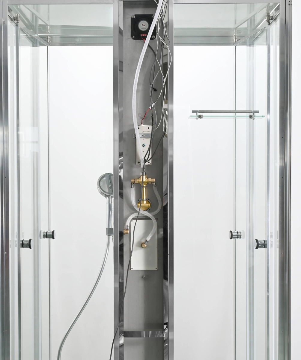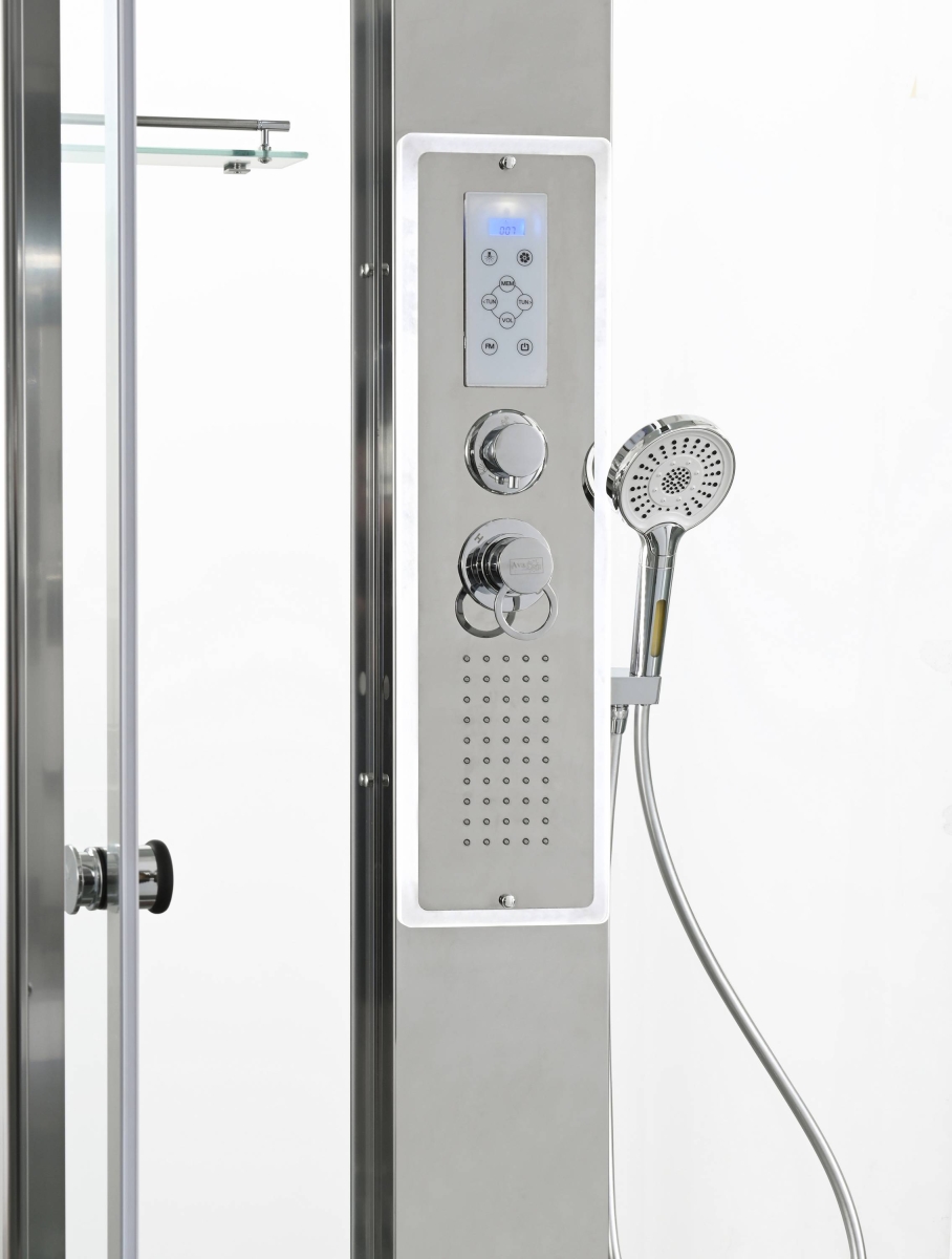- Оснащение: Блютуз / LED подсветка /радио /вытяжка/гидромассаж спины/сифон/ Переключатель режимов /2-е Полочки /резьбовой смеситель / Тропический (верхний) душ/ручки дверей / центральная панель из нержавейки /арома-лейка с витамином С/ Душевая штанга