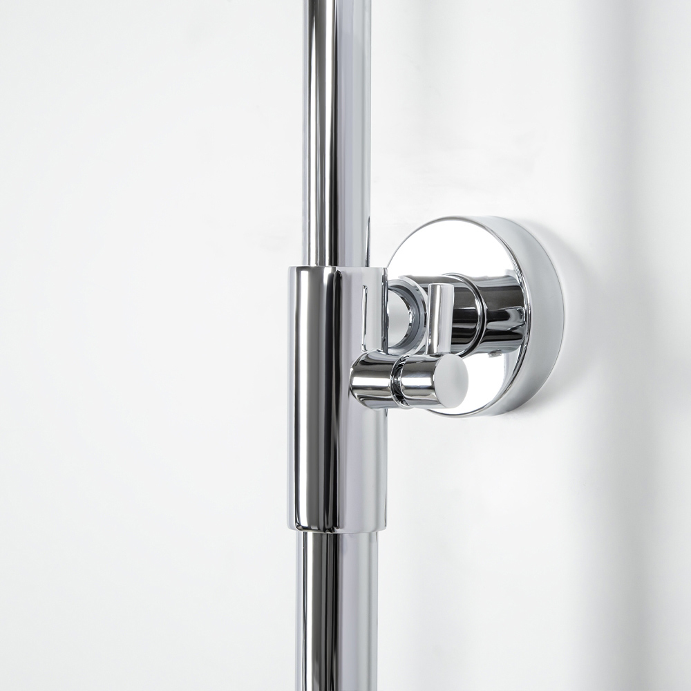 - Комплектация для сайта: смеситель; эксцентрики; душевая стойка; верхний душ; ручной душ; душевой шланг; инструкция.