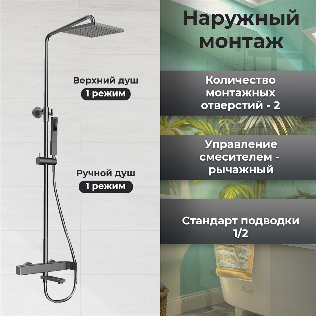 - Монтаж (Смеситель, Душевая программа): на стену (наружный монтаж)