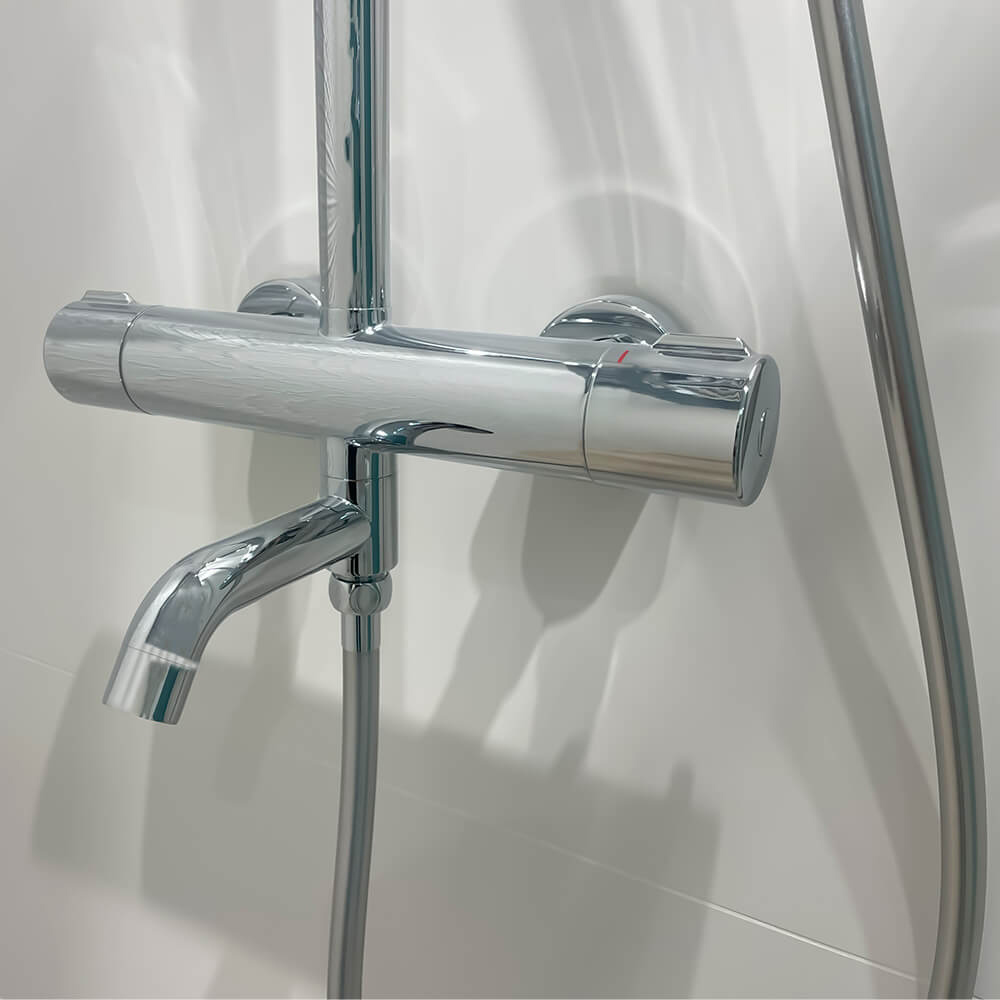 - Комплектация для сайта: термостат; верхний душ; ручной душ; штанга; душевой шланг; эксцентрики; инструкция.