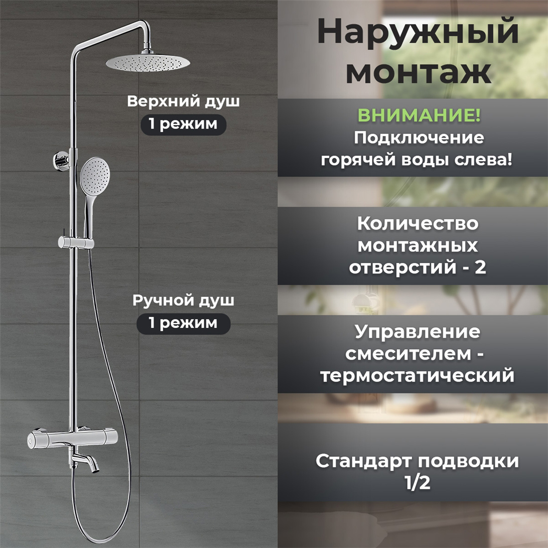 - Монтаж (Смеситель, Душевая программа): на стену (наружный монтаж)