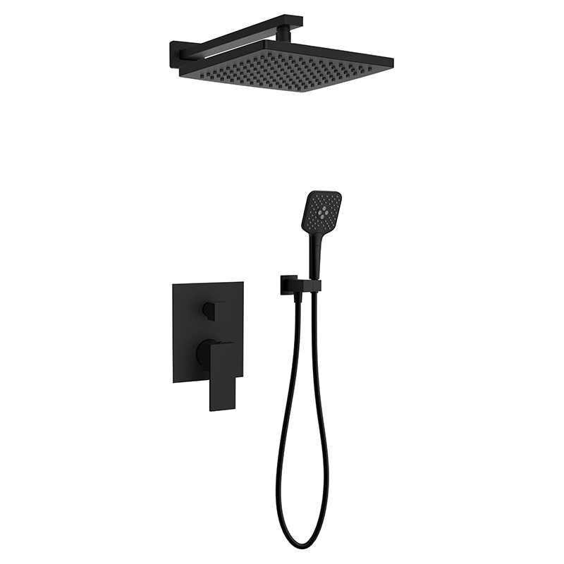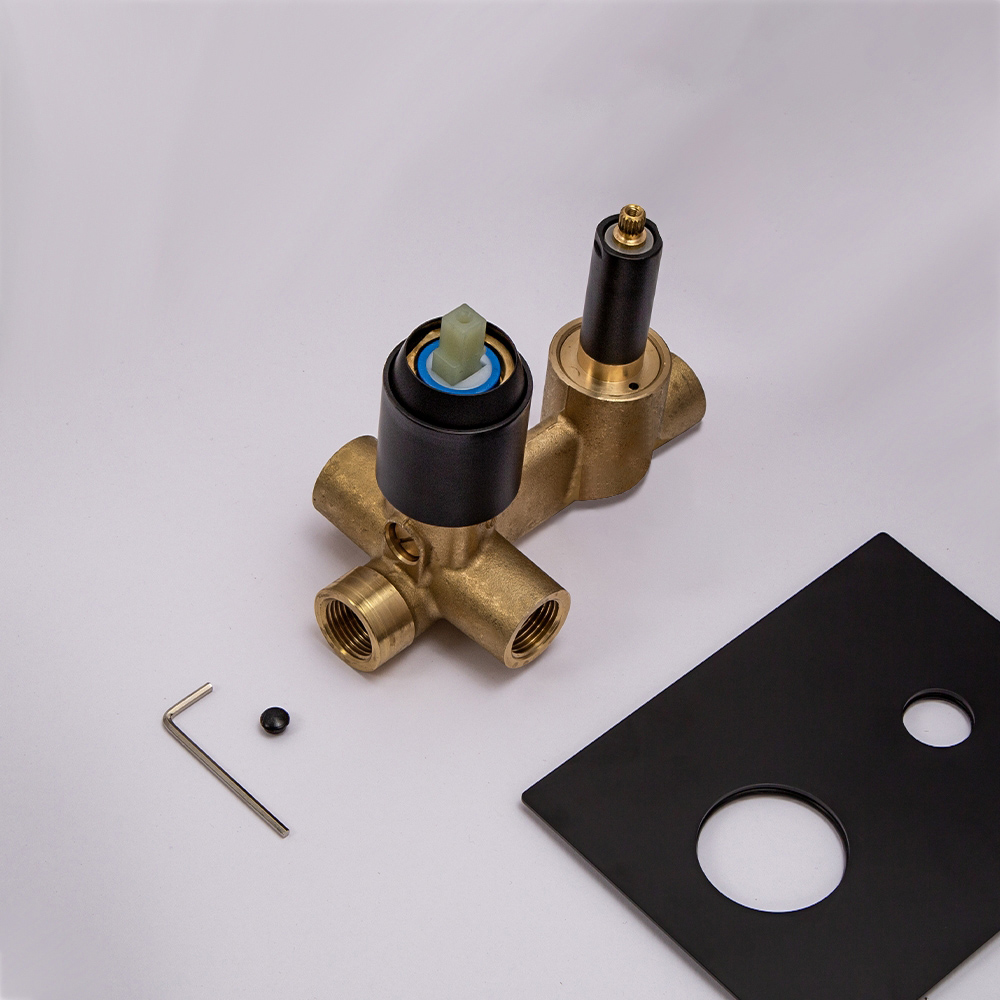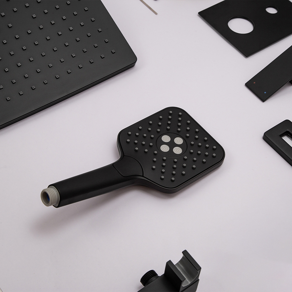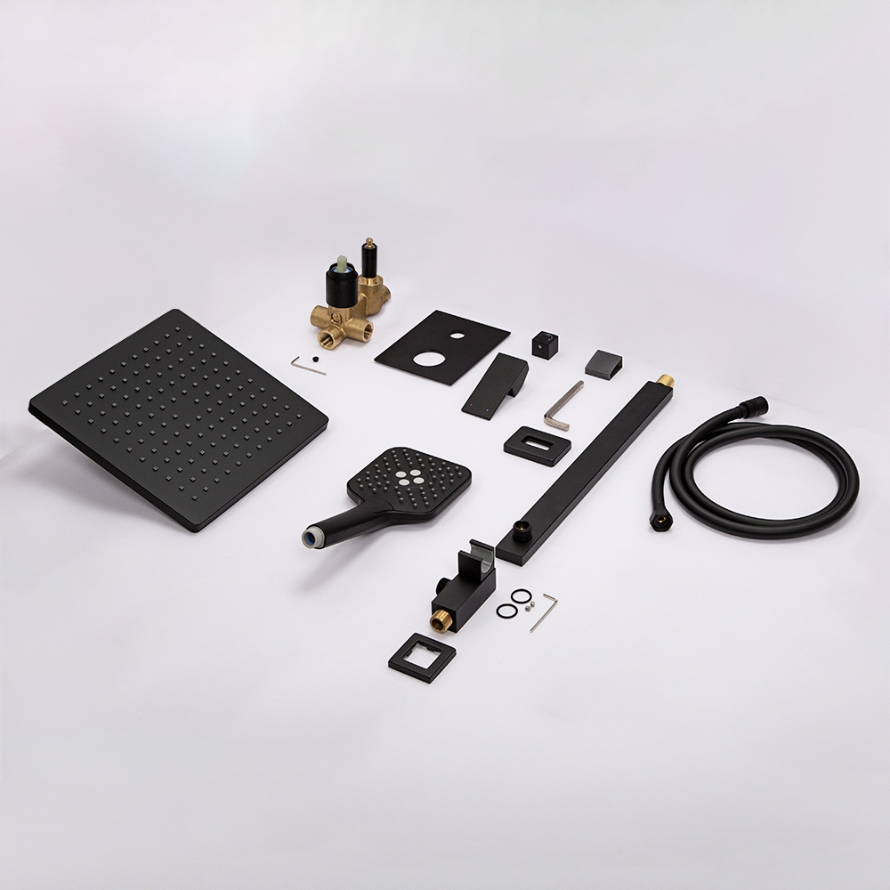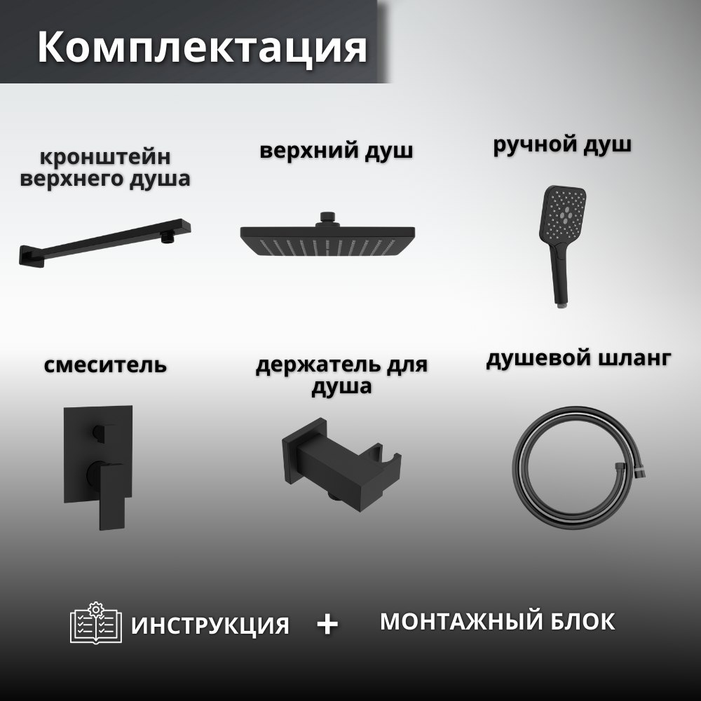 - Комплектация для сайта: смеситель; монтажный блок; верхний душ; кронштейн верхнего душа; ручной душ; душевой шланг; настенный держатель; инструкция.