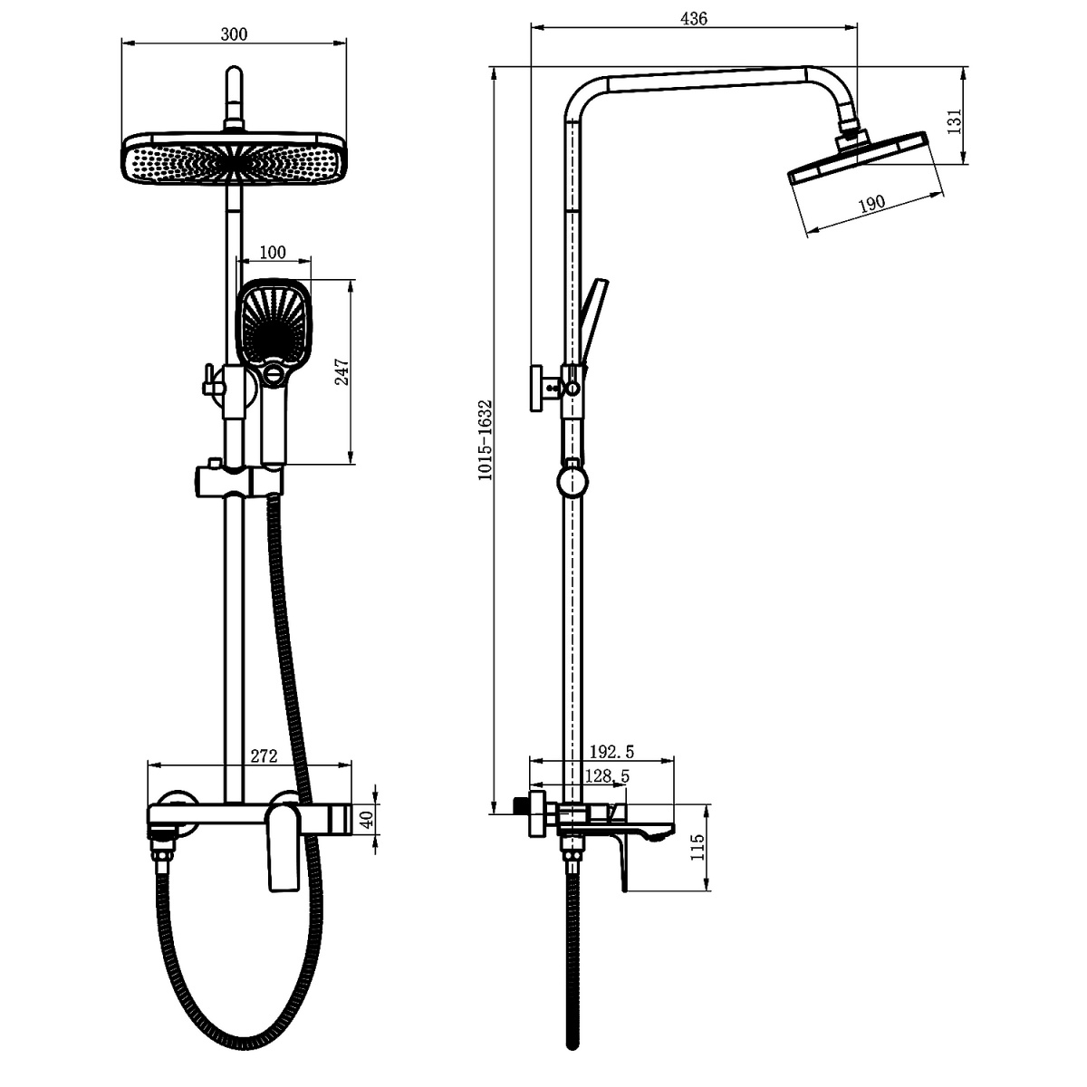 | Оснащение.: | верхний душ/держатель для душевой лейки/душевая лейка/душевая штанга/душевой шланг/комплект отражателей/Ручной душ/смеситель/эксцентрики |