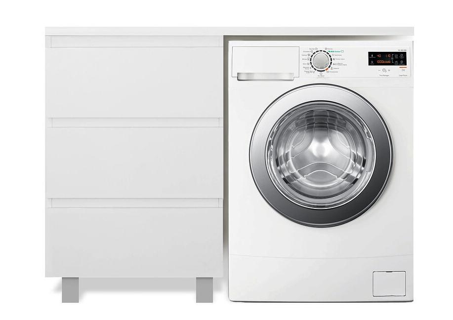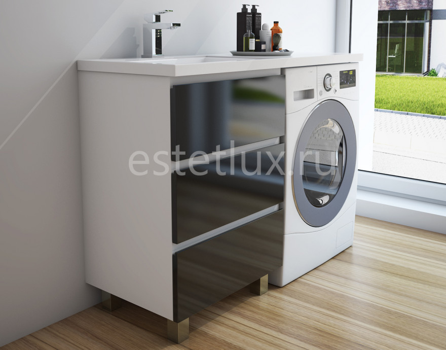 Тумба у комплектована раковиной из литьевого мрамора с удобной чашей, стиральная машина устанавливается под столешницей.