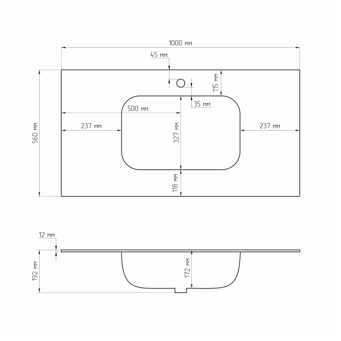 - Дополнительная информация: матовая столешница из керамогранита толщиной 10,5 см; сифон диаметр 3,2 см; край столешницы 45%.