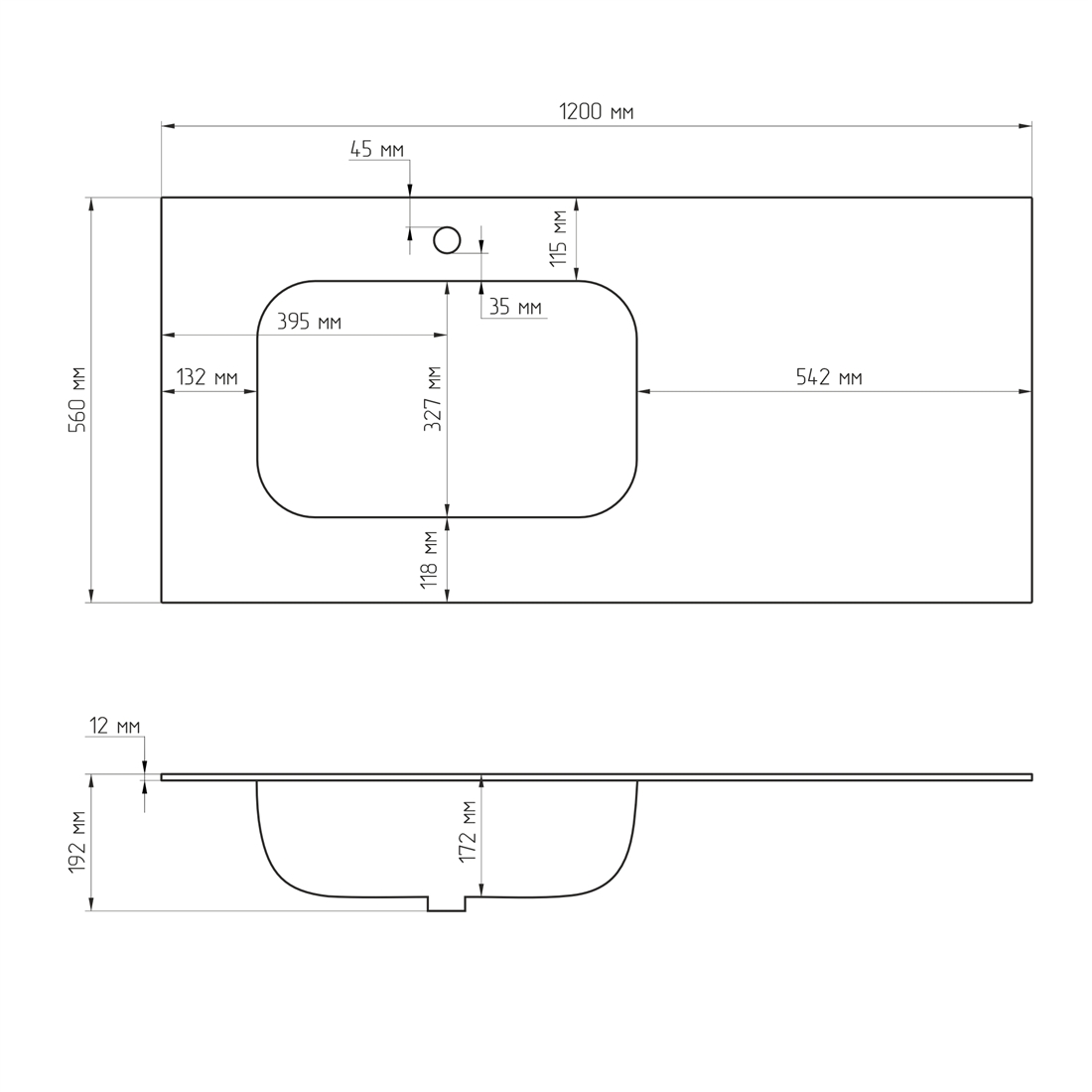 - Дополнительная информация*: матовая столешница из керамогранита толщиной 10,5 см; сифон диаметр 3,2 см; край столешницы 45%.