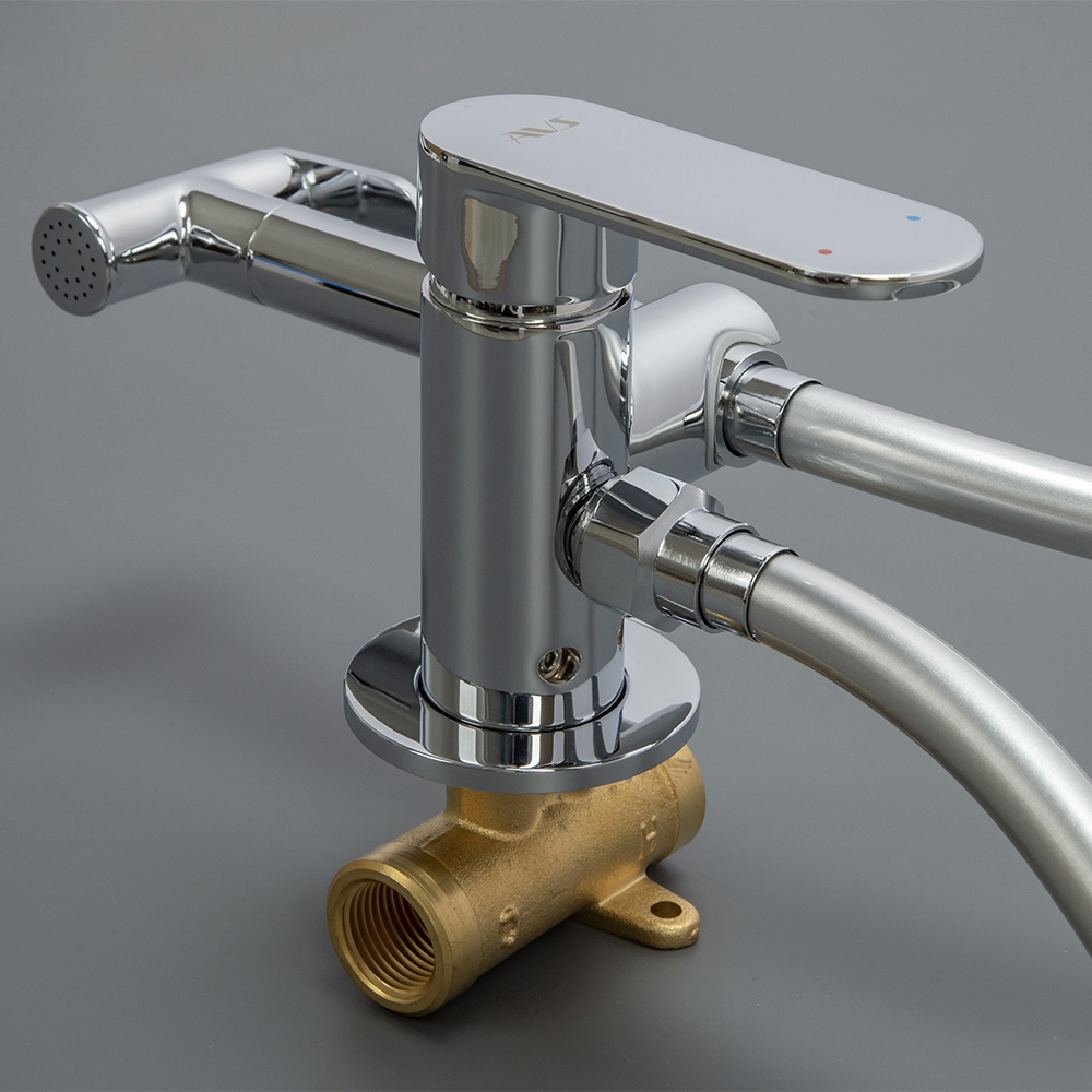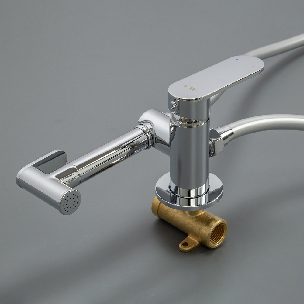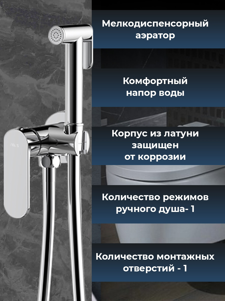 - Комплектация для сайта: смеситель; монтажный блок; гигиенический душ; душевой шланг; инструкция.
