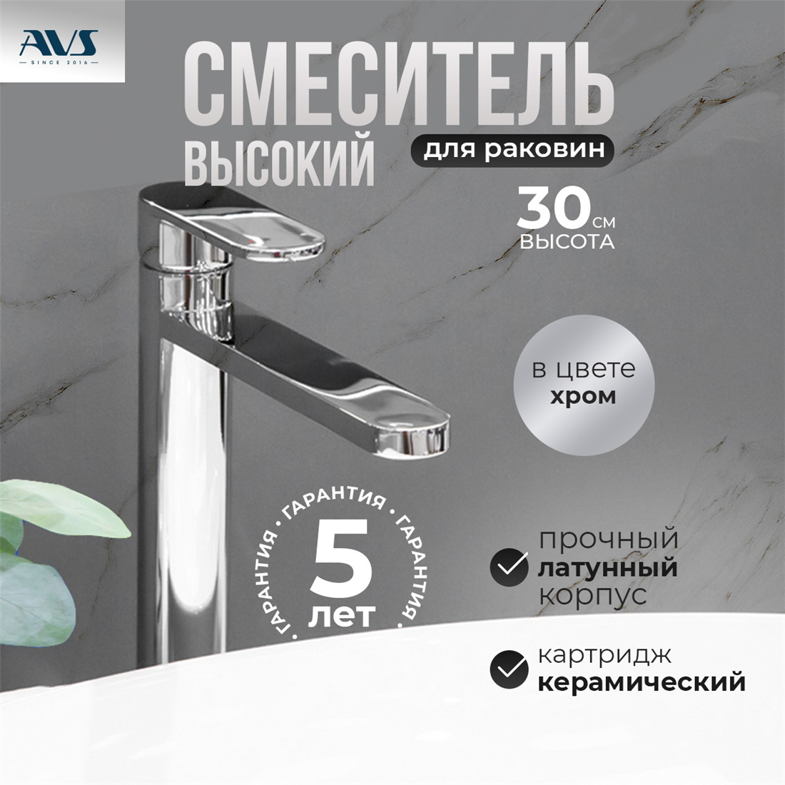 Смеситель для раковины AVS Beauty высокий, хром
