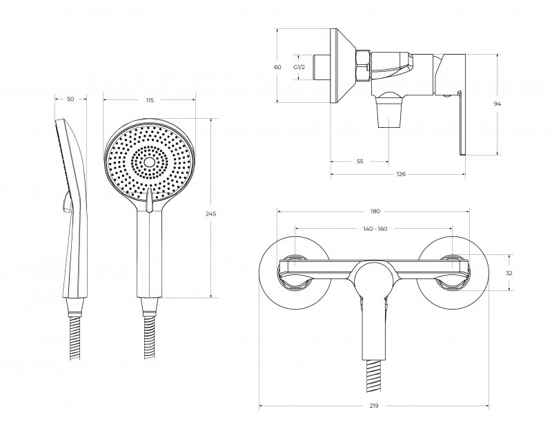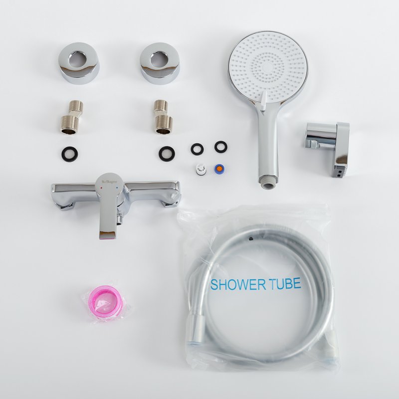 - Оснащение: душевой шланг ПВХ, ручной душ 3-х режимный, настенный держатель ручного душа, смеситель