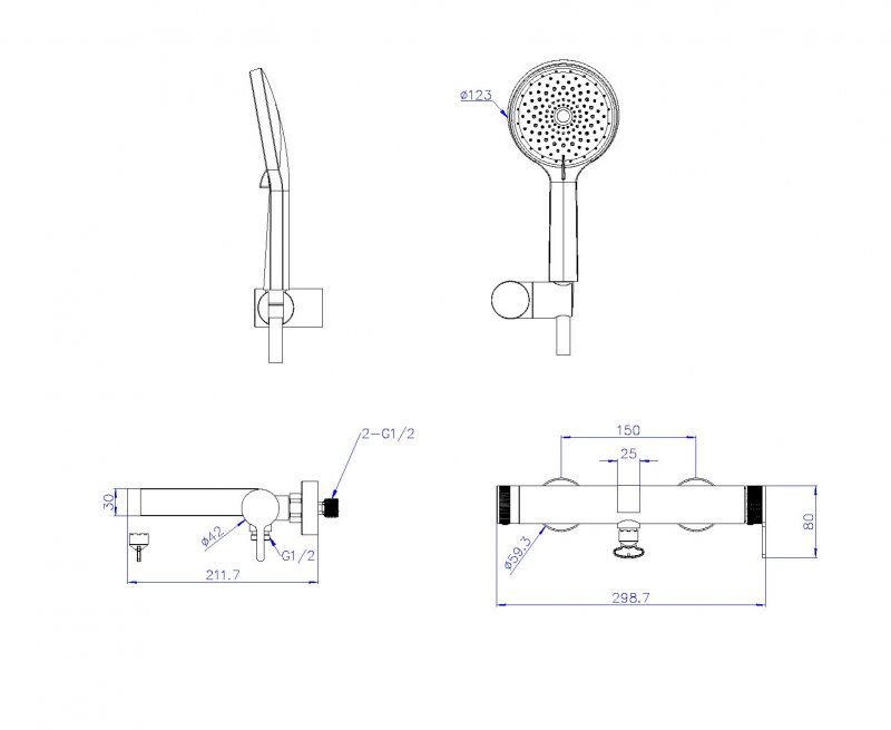 - Оснащение: эксцентрики, аэратор, 3-х режимная душевая лейка из ABS, душевой шланг 150 см PVC, держатель душевой лейки из ABS