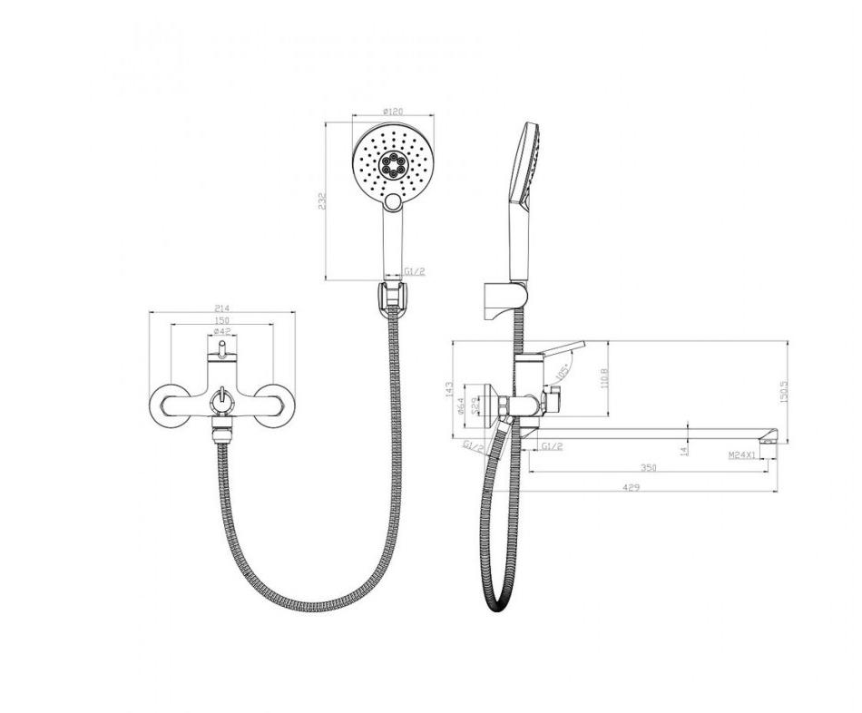 - Аксессуары в комплекте: шланг 1,5 м, настенное поворотное крепление, 3-функциональная лейка Ø120x240 мм